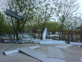 This morning a severe storm blew through the Ashram. The photo shows what happened to our parking shed which is about 50 m away from the scene of the photo. With the storm came rain meaning that today may be the first day with a temperature below 40 since 23rd of April.